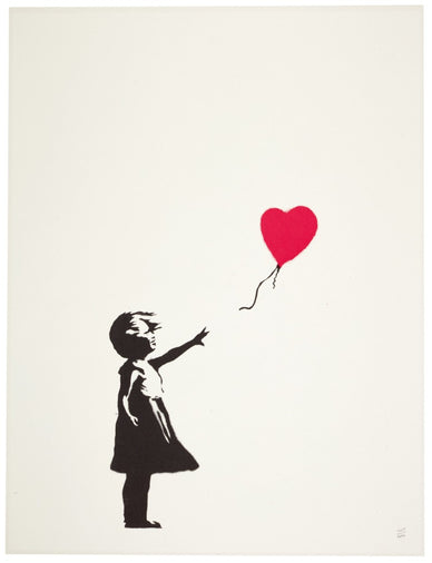 Originally appearing as a stencil on the streets of London, Balloon Girl depicts a young girl reaching toward – or letting go of – a bright red, heart-shaped balloon drifting into the air. Banksy’s use of stark black-and-white contrast, punctuated by the bold red balloon, makes this piece instantly recognizable and emotionally resonant. The imagery has become a global symbol for dreams, freedom, and the bittersweet passage of time.