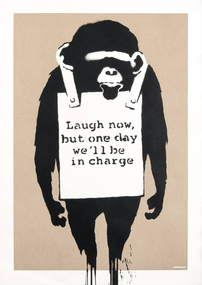 The chimpanzee, historically used in art and popular culture to represent something primal, “less evolved,” or comedic, is turned into a symbol of rebellion. Banksy flips the narrative: the creatures we laugh at today may one day rise above us. The phrase on their boards feels like a prophecy — a reminder that every hierarchy can be overturned, and that those underestimated or marginalized might hold the future in their hands.