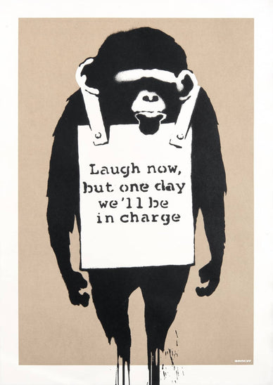 Laugh Now is one of Banksy’s most thought-provoking and widely celebrated works, originally commissioned for a Brighton nightclub in 2002. The piece features a row of chimpanzees, each wearing a sandwich board that reads: “Laugh now, but one day we’ll be in charge.” On the surface, the imagery feels playful — even humorous — but beneath the wit lies a razor-sharp critique of power, society, and human arrogance.